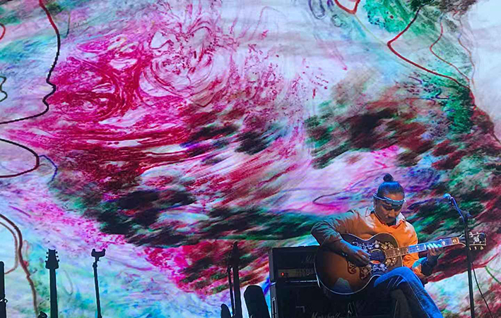 此次法国蓬皮杜艺术中心成都双年展,无定义音乐节单元的演出又是一次老五跨界的尝试,与脑电波科学家合作,试图将无形的感知通过实时的演奏所产生的生物波当下呈现为视觉,以多感官的手法让观众体验这个在媒介和能量中自由生长的主体。更是与脑电波科学家合作进行数据采集,发现音乐镇痛的非凡效果,这是艺术疗愈可见数据化的一次有意义的尝试。