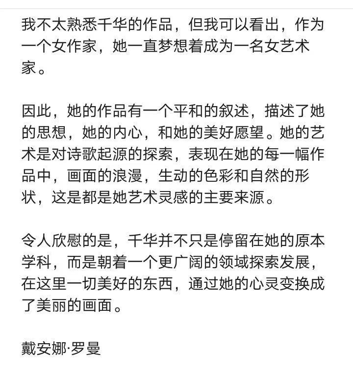 千华,女。北京师范大学文学博士。曾出版小说集《高丽女人》(香港安定出版社)、文学论文集《艺术创造之光》(作家出版社)。创办企业多年,曾任北京市昌平区工商联副主席、政协常委等职务。近年来创办过北京105艺术沙龙。目前以绘画为乐。