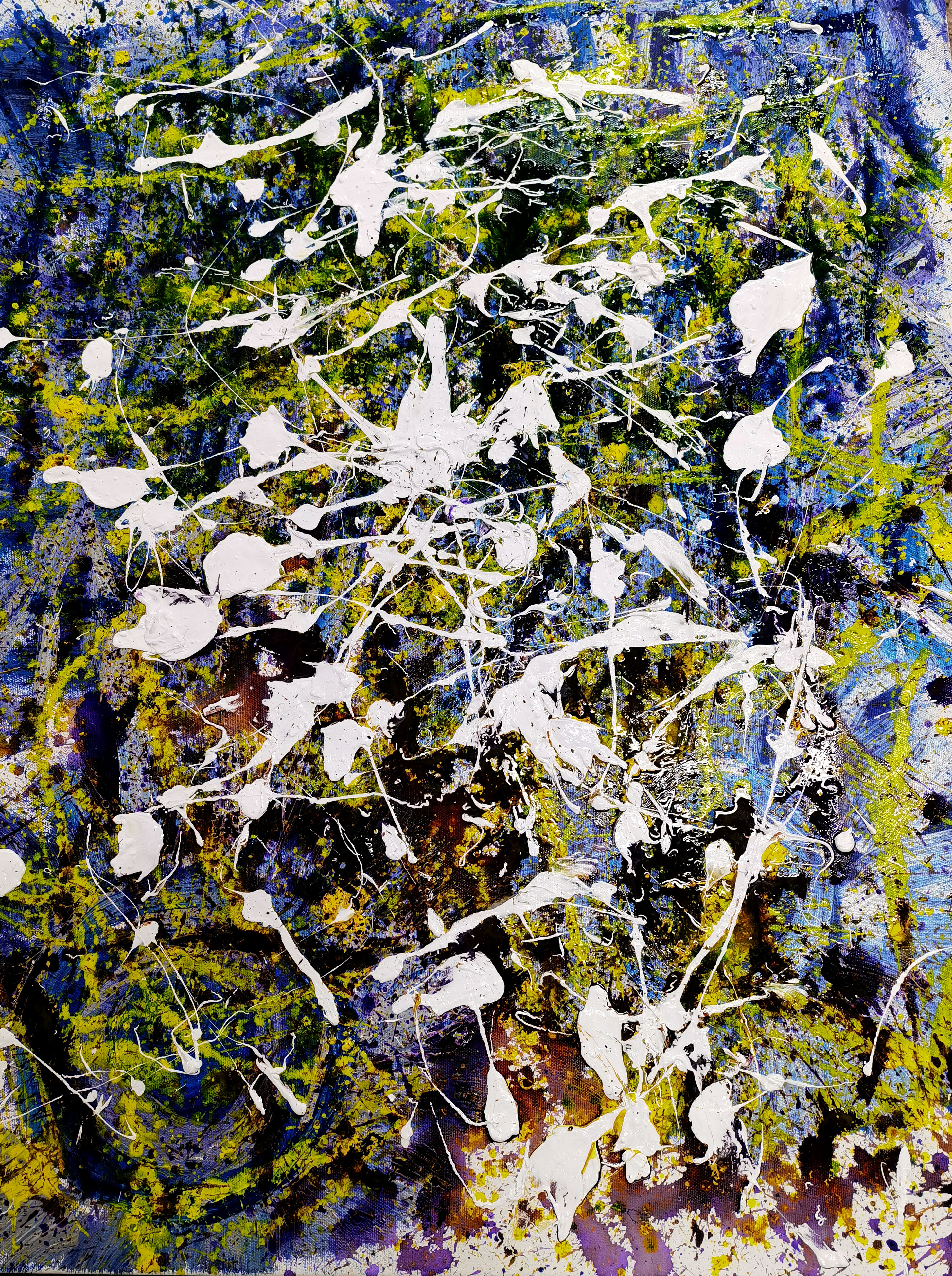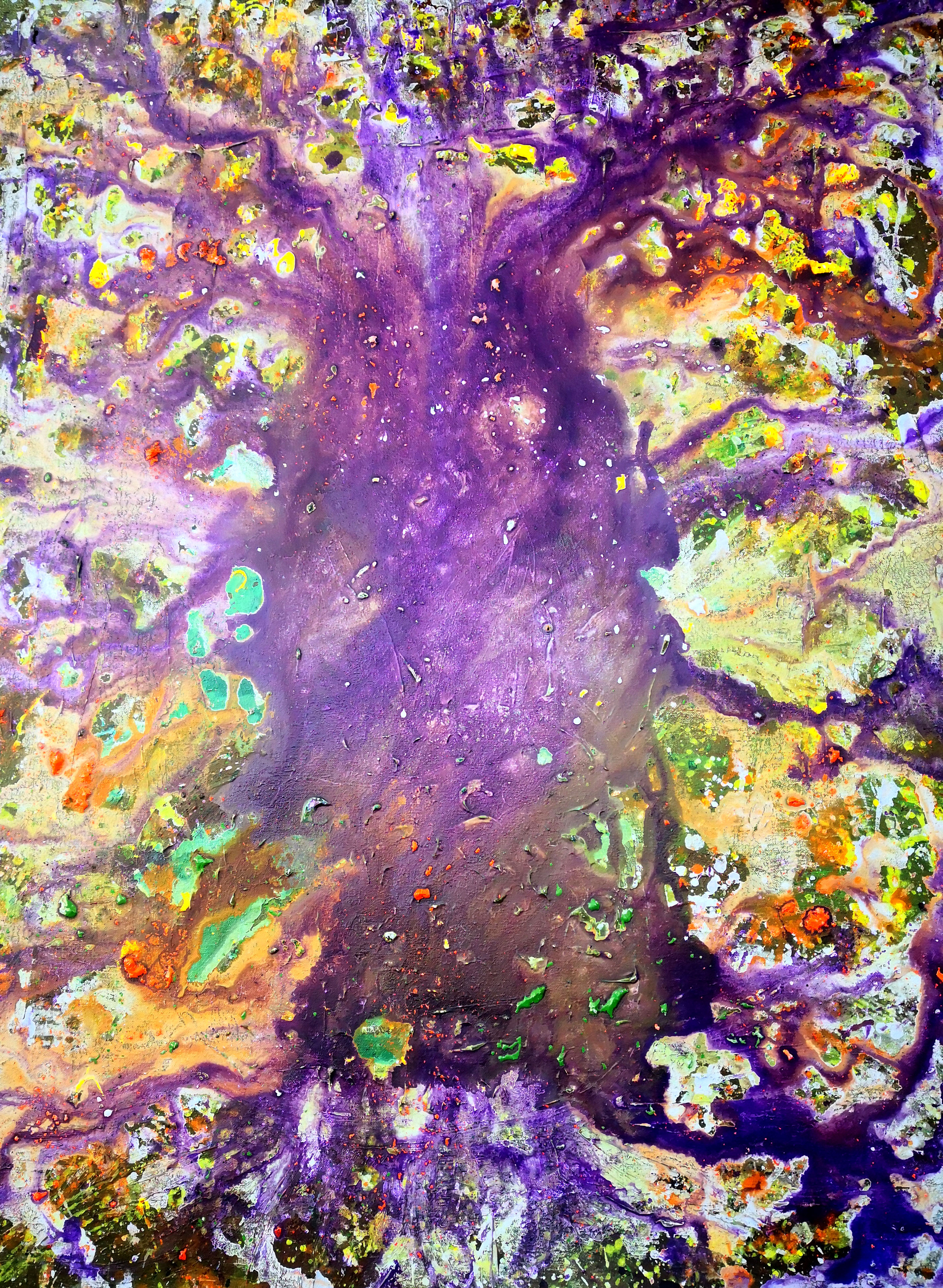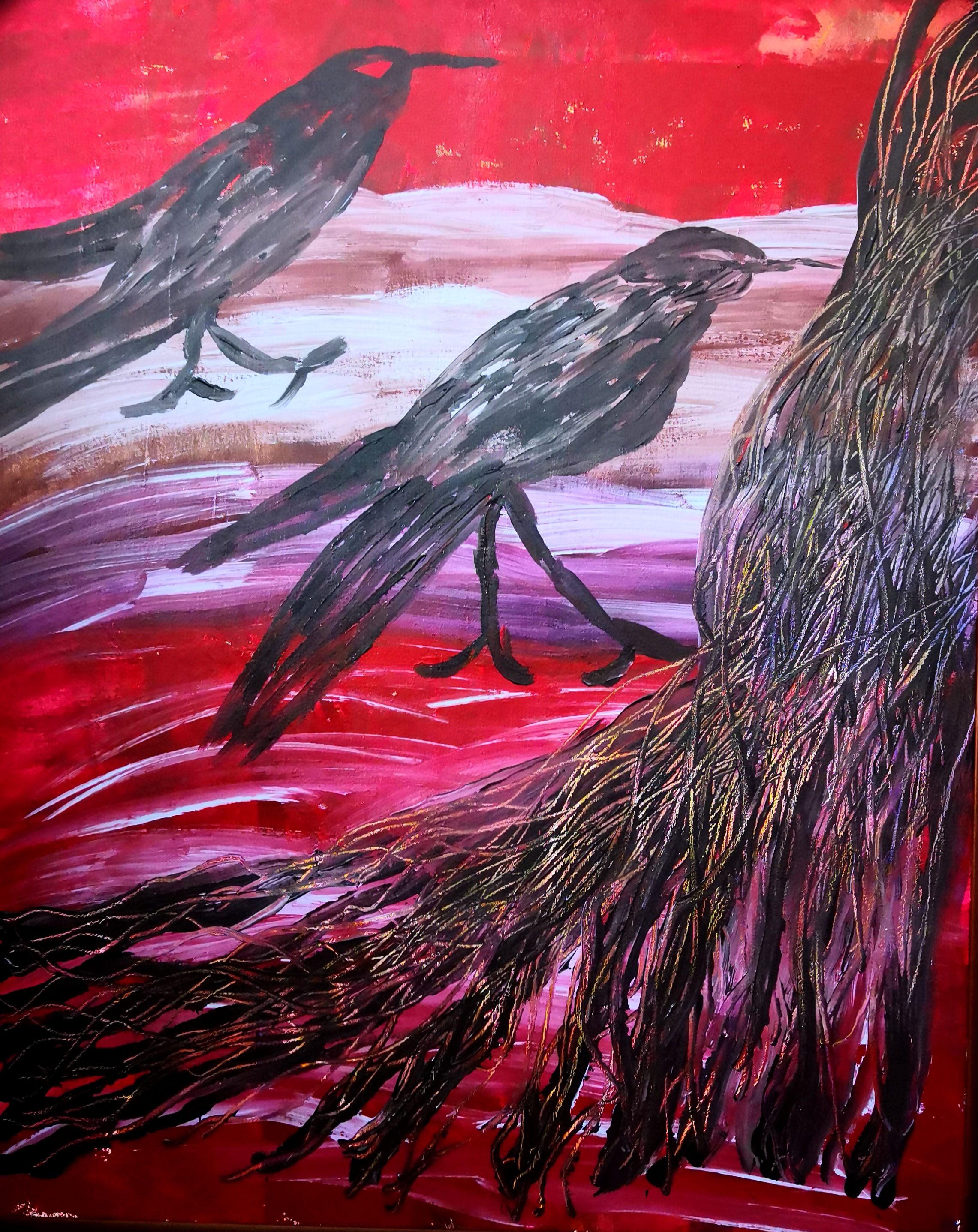海男的绘画,当然不可能是众多学院派的绘画,她的存在,让我们回顾着她的写作,三十年来的诗学之路的独立美学。当我看海男的画作时,我有一种在云南大地上行走的感觉,而当我眼前产生一种无法言喻的色彩时,我仿佛走进了海男的画室中去,看见了海男的花园和无穷无尽的山水,那些迎着春夏秋冬绽放并互相交叉而伸长枝杆的花枝,是孤独者的吟唱,也是众神的演奏。