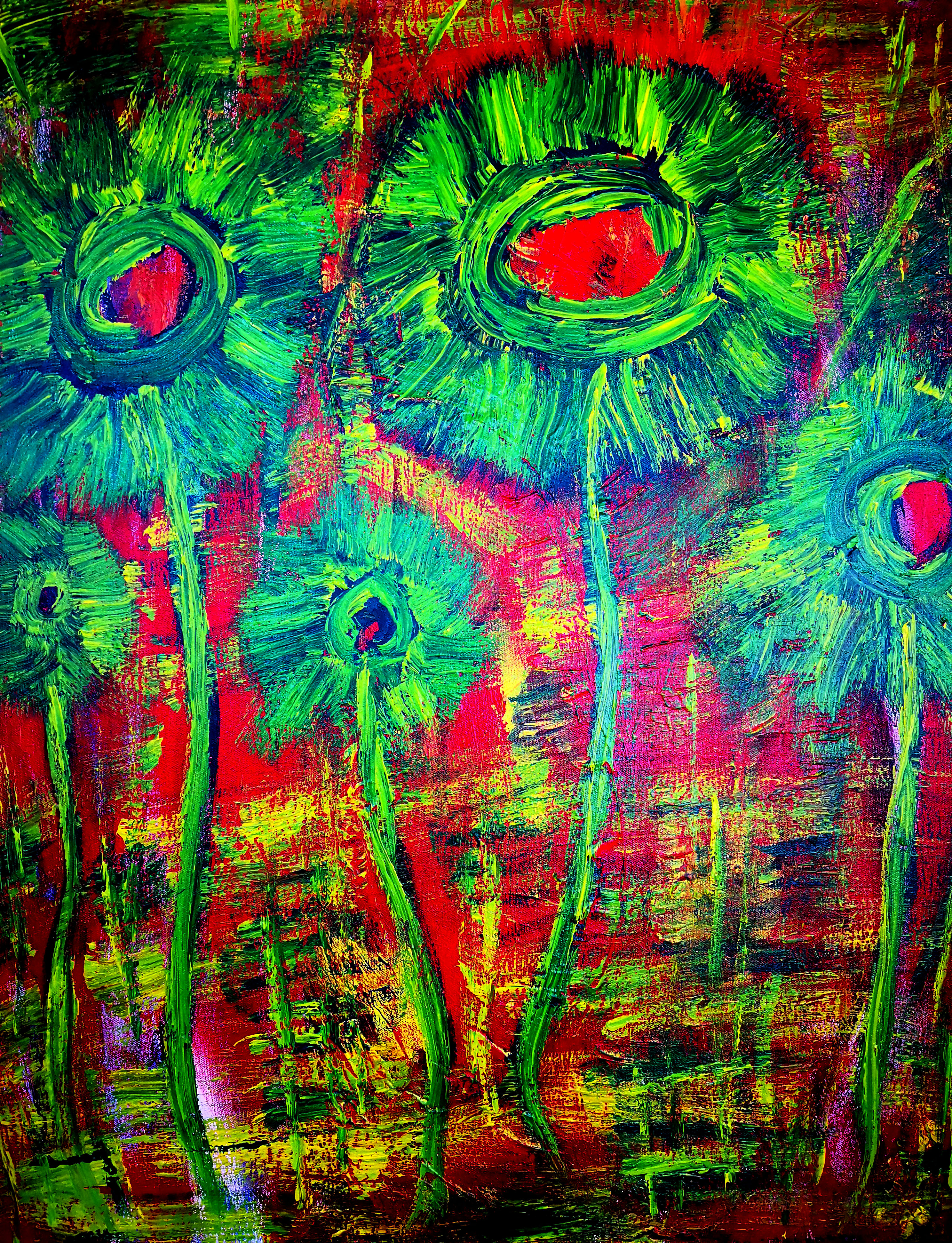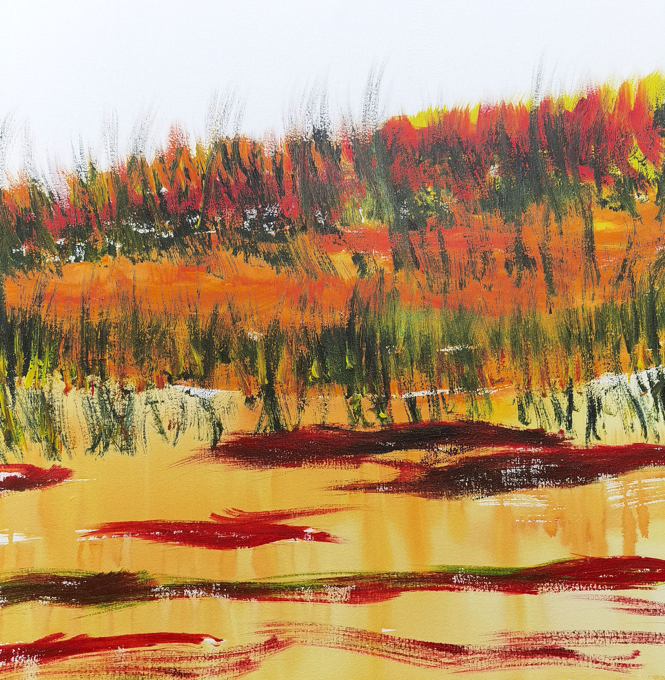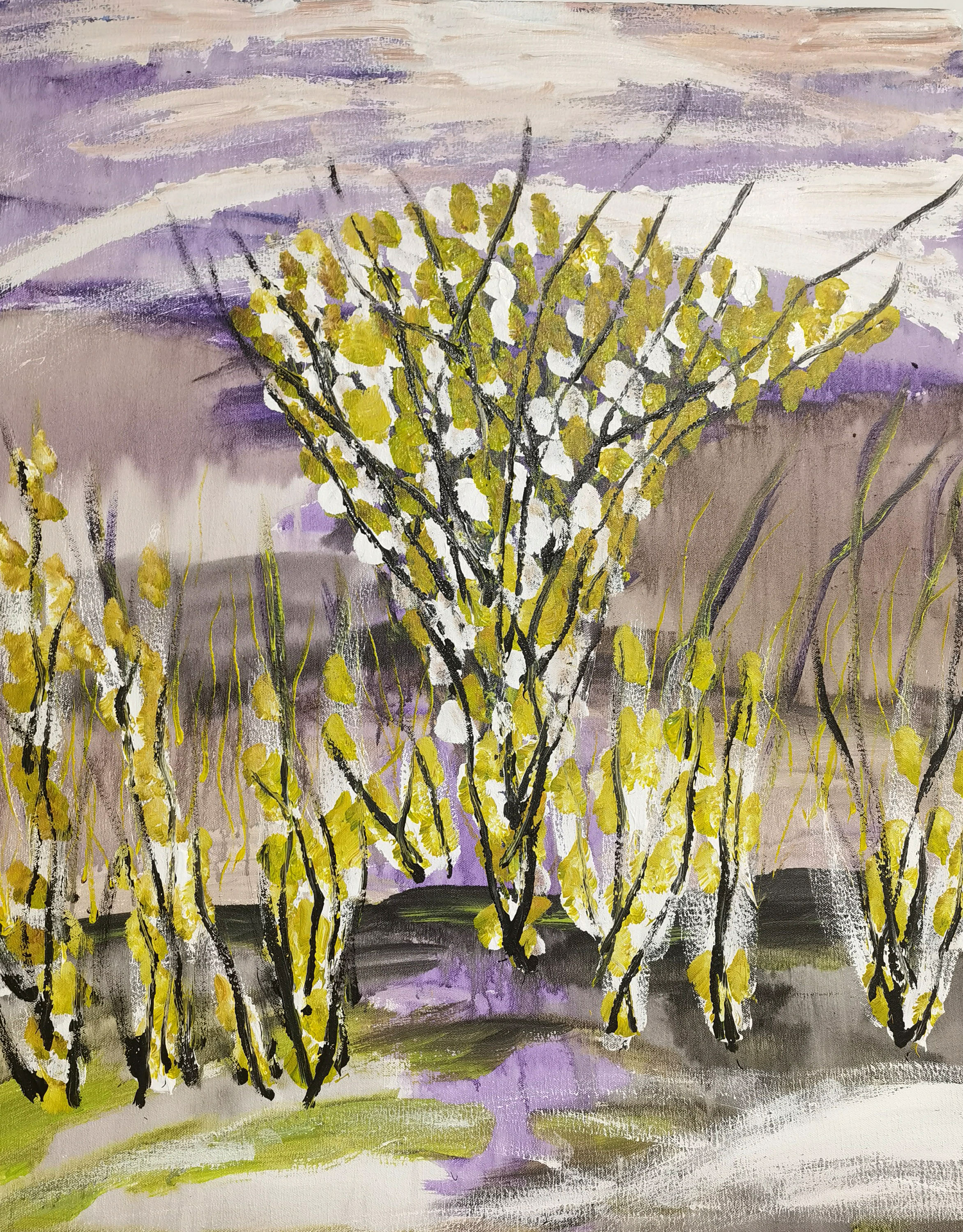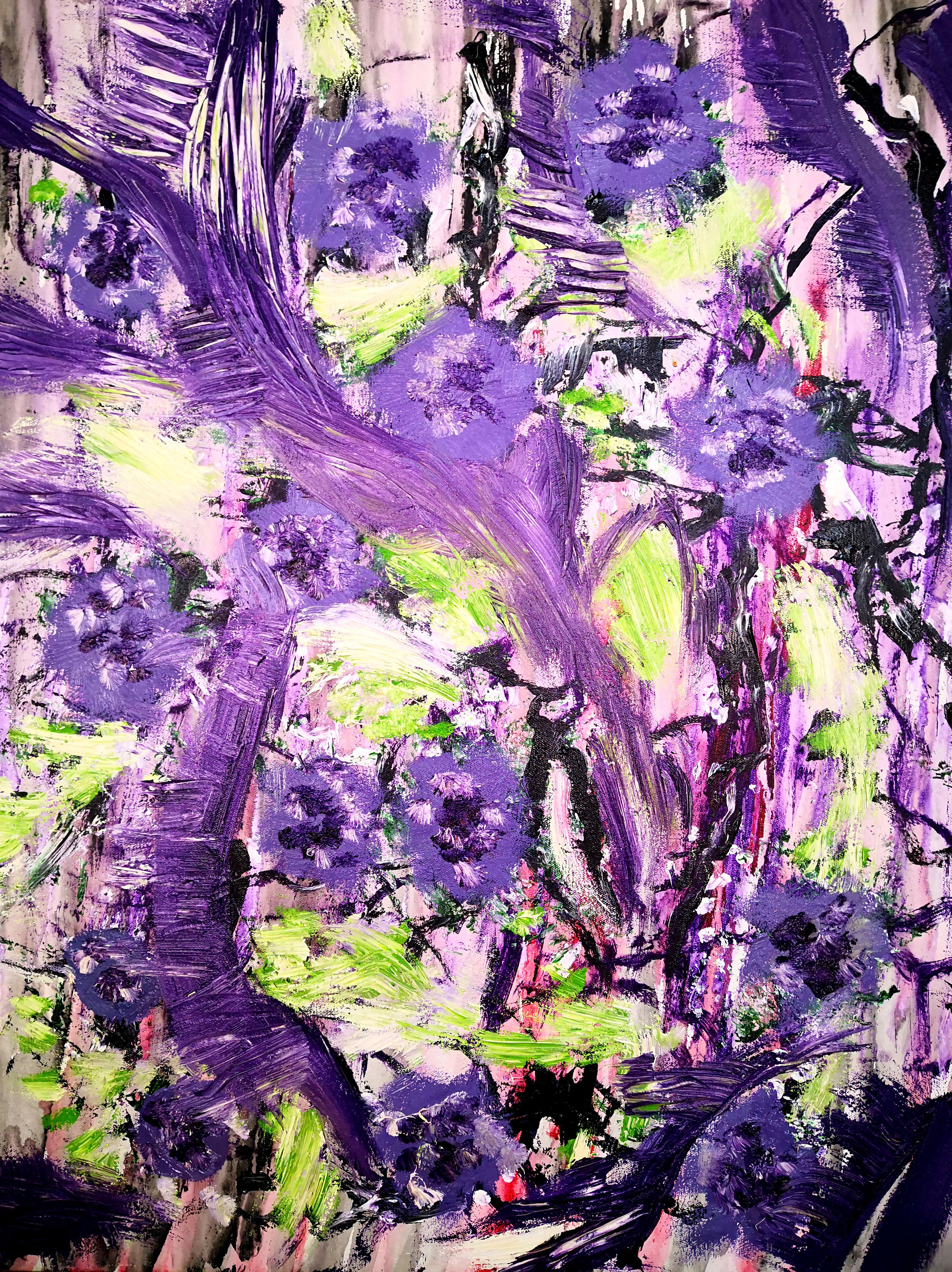 当然,画就是画,海男的画面处理,似是而非的风景学,使用薄画法,水墨画晕染般大笔触,轻松透明,色调鲜明。画面主形象占据画面中心,使用干涩而浓重的厚堆方法,强调力度、筋道和有弹性的笔触,使其她众多的画品中流露出潜在的魔力,这一切正是海男风景画中独立的艺术径道,它通向的是一座座原始森林,或者是一座座神秘花园。