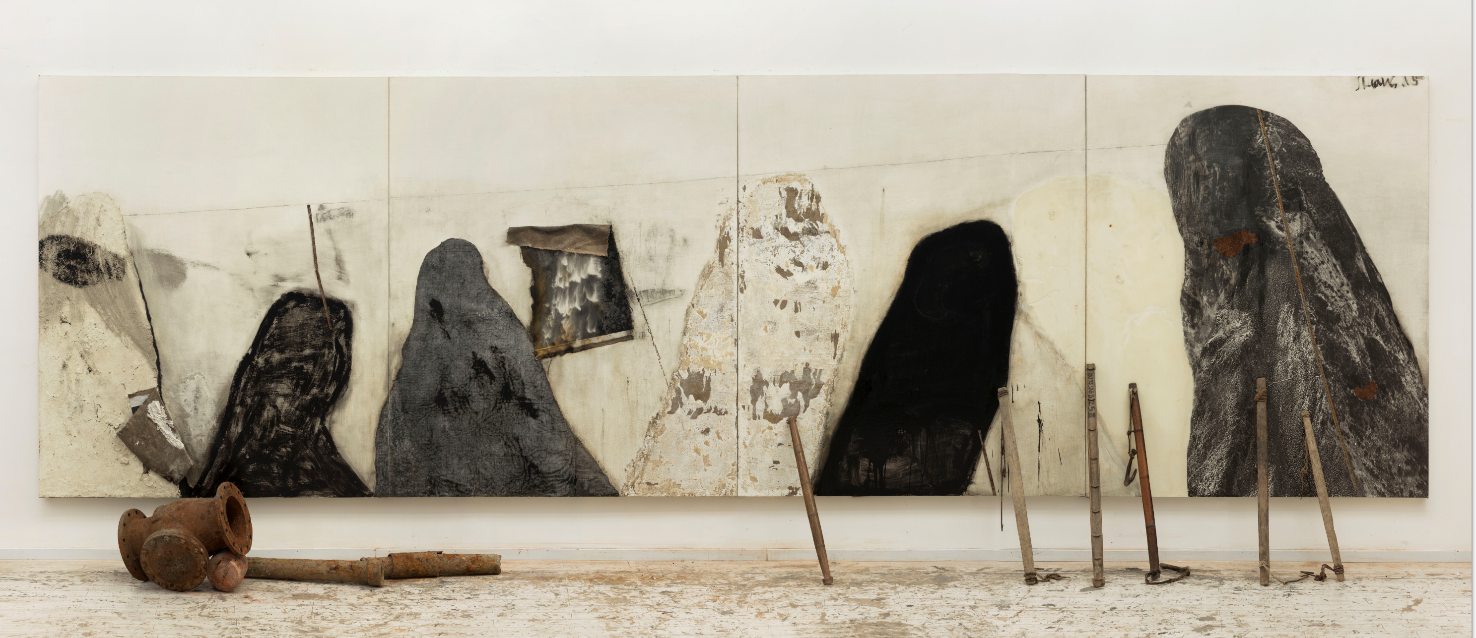 尚扬作品:《剩水图》 布面综合材料、现成品及多媒体装置 253x852cm