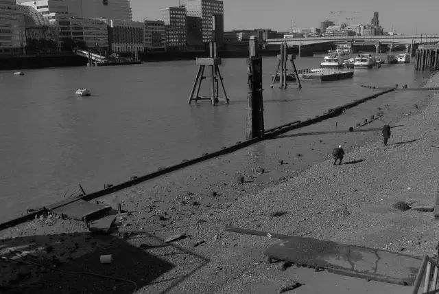 伦敦塔桥,桥下面是泰晤士河,水落下去了,可以顺着石阶走到河滩上,河滩上的很多碎片都是被河流千锤百炼出来的工业废品。