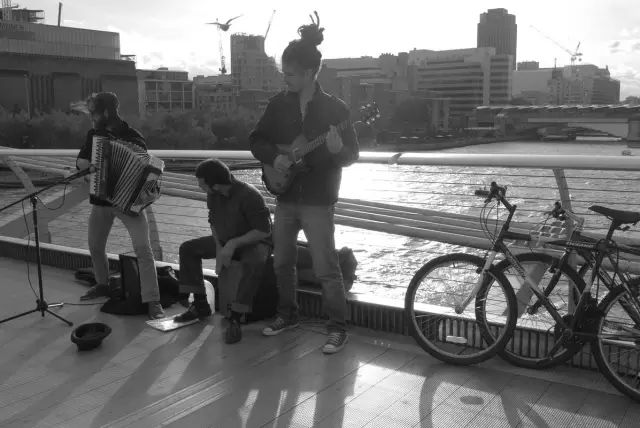 桥上有一个乐队,三个人。一个电吉他,一个手风琴,用一只音箱的背面当鼓,他们发疯般地唱着,弹着,拉着,麦克风脚架下面摆着一顶用来收钱的帽子。