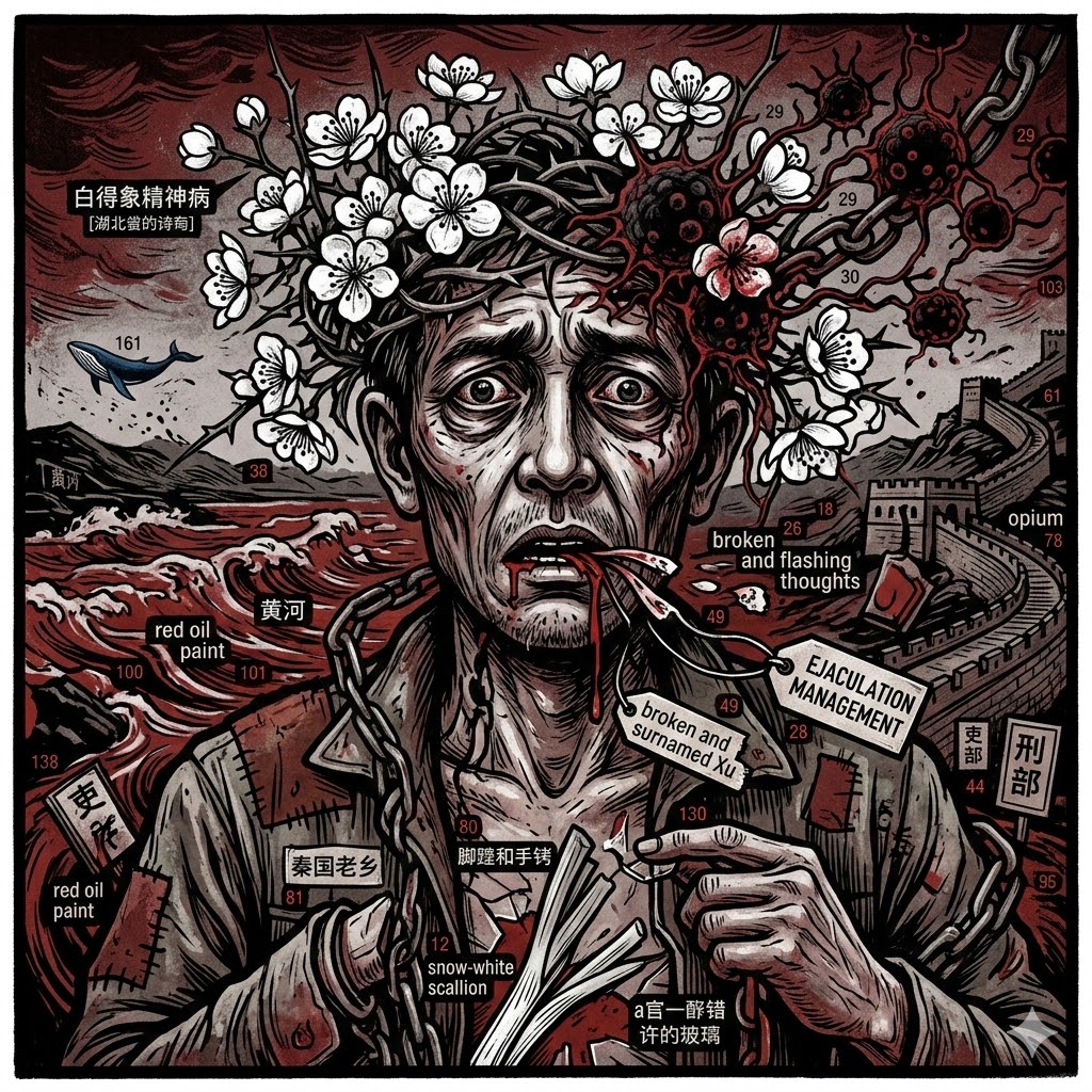 梨花。白得象精神病。 我正按着一面姓许的玻璃,来回擦拭 “来啊。快活啊 。反正有。大把时光。……” 黄龄一开口 春天就变慢了,所有的花朵含有大量的荷尔蒙 肥胖的黄蜂伏在玫瑰花上 羞死人了 许书记的宝贝女儿更丰满了…… 顾桃,那兰,杏丽 三位女子走路去巫山,也可能是去罗马 她们要干什么哩?露出一段雪白的葱,散发美味的气息 不管是美艳的贞女或荡妇 在二0二六年立春 我不射精。 坚决不射。 滚吧。太阳。 梨花。白得象精神病。 春晚。阿菲她蜂的腰,蜂的娓,蜂的唱腔 在私藏的国境线里 快把我逼疯了 我不喜欢她在温柔乡里慢性杀人,也不喜欢五匹马的力 在咸阳 分裂一只年老的黎 有没有人能接得住 智英那些破碎又闪光的念头? 2026.2.14 射精管理 我是一个看热闹的癌细胞 我要扩散。 我要扩散。 雪崩的时候,人民迅速地围过来,他们相互庆幸 是时,黎,正埋在生活中饱受宫刑 作为汉人 我能完整体验他痛苦的形状 阉割,是一种下流的手术。 我不敢叫出她的名字 安生,快跑。 几个锦衣正围了过来。 爱自由的鸟儿,看见他们,就飞走了 真相是 一个有睾丸的人比没有睾丸的人更难受 趁梨花。沽酒。 吏部 许,穿着美尔雅的汉服和蛇皮的丝袜 当泸酒铺的老板娘,在黄昏中,她采用了最好的美术 但是。司马兄。 阴茎失去了美学。 红色的水 在燃烧时,流出比死还愤怒的液体。 2026.2.15 去人间卖命的人都回来了 客官,你见过我姐姐秦娥了吗? 北风那个吹。雪花那个飘。 狗日的。 一想到姐姐,我就恨死了长安君。恨也没有用 她的胃 首先是空虚,空虚,空虚,许久。 终于 ------饿殍。 长城还没修完哩。 孟姜女就哭倒了它。 她破碎着哭声和我母亲的哭声一模一样 死去的胃,躺在秦娥的尸体中,依然睁着未成年的 单眼皮。 死去的两条河,躺在妈妈脸上 依然有 十级疼痛 长江流到一九五八年,在汉阳附近停顿了十年。 "去死吧,商鞅同志。" 太迟了,他已将癌细胞,种进了东半球的子宫 去人间卖命的人都回来了 秦娥扫过了奈何桥上的二维码,就看见了孟婆婆 她说: “姑娘,请喝了这碗汤。” 梦见死人。吉。 2026.2.16 鸦片正在安慰咆哮的大海。 老黎。 我一眼就认出了你。戴着鲁迅最讨厌的脚蹽和手铐 我们还是秦国的老乡哩 这个古怪的人,有着富裕的苹果与金婚 今天,宫中说话安全吗? 剥一张人皮与反对秦二棍 哪一件事,我都不敢做 像一个坐过牢的诗人,经常看见海子卧在铁轨上回家。 眼前这棵青松,他也不敢活了 杨炼先生,我胆小和怕事。 每次将自已的苛且和恐惧迁怒于心脏 和肾 甚至迁怒于多年前的结石 四只水鸟从转动的地球上消失 吏部的处方中含有大量的鸦片 慢性的。阉割。不痛。不苦。不象 刑部。安生 漂亮的女特务回来了,她私藏一支自由的铁 危险而美丽。 鸦片正在安慰咆哮的大海。 2026.2.17 一条大河心生怨念 一条大河心生怨念 许多人,走着走着,就死了 癌细胞。流入黄河的血管 在人民的器官上产生大量的裂变,肺的痛并不能止住肝的痛 和记忆的痛 一想到傅雷 他好看的表妹,温柔的妻子 细心整理好一粒米,一寸布,一封遗书,就跟着死去了 一想到陈寅恪 那些被吓死的人,仇应该由谁来报? 一想到海子、方向、弋麦、许立志…… 我想…… 三公主杏眼一瞪说,“想也不行,想也有罪。” 东半球平静地注销了死者的名字 这些父母给的命,只是多认识了几个字 就该死吗? 三娘,对不起 我这个湖北人很怂,洁白的纸上 什么也没写。 2026.2.18 中国红。有的人欢喜,有的人害怕。 真正的秦国人死法不止有一种 国家,太胖了。老黎总是这样说。一匹马的力揭开头盖骨 一匹马的力 割断她的声带 是那种令人类肝,胆,突然破裂的 法术 以至于刑部的人,每天要从京城搜捕到大泽乡 许多人,听着听着,就吓坏了 我每听一次,都要把心事用手淫诉说一遍 我不是唯一这样射精的人 爱吃胭脂的宝玉同学 他去过地安门 他在梦中惊叫 “可卿,救我!”。 六月四日 苍蝇:腐败、死亡、敏锐的感知者们 总是第一个找到血管中喷出的红色油漆 它们多么兴奋呀 路边上的人吃了一惊 中国红。 有的人欢喜,有的人害怕。 2026.2.19 海洋中出现缺氧的闪电。 梁兄 只有你与你喜欢的人,才会变成一对绿松石色的蝴蝶 越是漂亮的女子 越是命薄 林昭姑娘坐上了西行的航天器。 为什么所有的尸身都原谅了我? 多年前 有位小巧的女孩敲开了《空房子》的门 她想见见 “杨春光 你是中国的脑血栓” 坏运气总是跟着他,一块不知什么年份的铁 砸向了诗人的脑袋,鲜血突然开口说话。 这些红色,让太平洋变成了愤怒的汽油 孟护士惊呆了 上帝呀,请喝杯敌敌畏压压惊。 一位摄影爱好者拍到一只反动的蓝鲸跃出水面 我操,海洋巨大的子宫 出现一道伤口 和缺氧的闪电。 2026.2.20